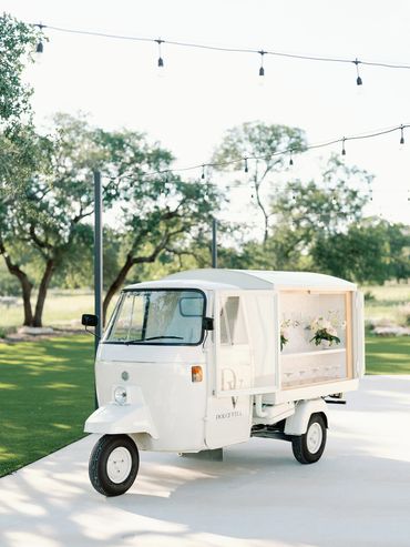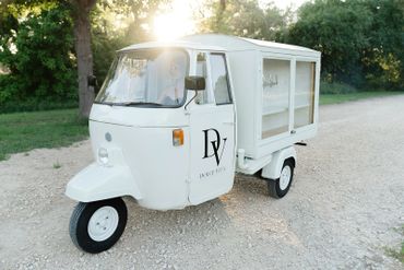 The Italian word Ape (ah-pay) translates to little “bee” in English. Our vintage bee, Francesca, traveled the streets of Italy, where she was used to transport olives, food, and merchandise throughout narrow village passages for many, many years. Destined for something more glamorous, she eventually set out on the long journey to Texas, where she began her extensive makeover into Dolce Vita ~ Luxury Prosecco Bar.